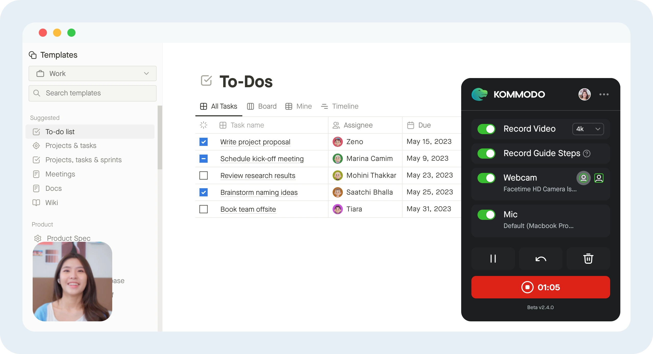 Kommodo is the modern way to take screen recordings and turn them into high quality videos, all within your browser. Leveraging the power of CaptureFusion technology, you're able to easily edit, rerecord, or overdub parts of your video.